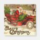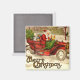 Magnet des Vintagen quadratischen Kühlschranks: Santa-Claus, der in einem alten Wagen voller Spielzeuge durch den Schnee kämpft