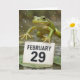 A frog leaps over a calendar page marked February 29, with sparkling water droplets and a vibrant green background symbolizing a leap year.