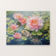 A pond frog rests quietly between blooming water lilies in a calm aquatic setting. The scene features soft floral tones and a peaceful atmosphere in painterly style.