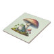 Ceramic tile with a cool illustration. Featuring a green frog sitting on a mound of grass. A big red mushroom sheltering him from the elements. A couple of little toadstools nearby.
