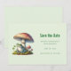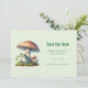 Save the date card with a cool illustration. Featuring a green frog sitting on a mound of grass. A big red mushroom sheltering him fron the elements. A couple of little toadstools nearby.