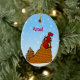 Diese kundenspezifische Keramik Weihnachtsverzierungsschablone hat ein niedliches Cartoonhuhn, Sie neugierig zu betrachten. Über der Henne sagt sie, "Aroo!" Huhnliebhaber kennen diesen Ton. Die Rückseite sagt, "dass Durchschnitte "frohe Feiertage" in Chook." Der Hintergrund ist blauer Himmel und fallender Schnee.