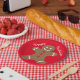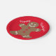 Pappteller mit der reichen roten Farbe, "frohe Feiertage" verziert mit einem süßen Lebkuchencharakter und im Weiß.