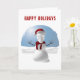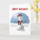 Frohe Feiertage Text, der von Ihnen angepasst werden kann. Ein lustiger Schneemann mit Totenkopf, der einen Weihnachtsmannhut und Schal trägt. Mit einem schneebedeckten Hintergrund.