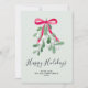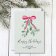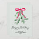 Diese grüne Weihnachtskarte ist mit Wasserfarben-Mistel, einem roten Band und stilvoller Schreibmaschinentypografie dekoriert, die "Frohe Feiertage" sagt.