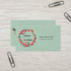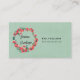 Visitenkartenvorlage mit einem hübschen Weihnachtskranz in Aquarellen. Rote Blume und grüne Blätter in kreisförmiger Form mit Frohen Festtagen in einem modernen, handgeschriebenen Schriftart. Auf der Rückseite eine niedliche Waldlandschafsmaschine mit roter Weihnachtsmannmütze - Hipster-Stil. Personalisieren Sie Ihre Geschäftsdaten. Set auf einem Retro-grünen Hintergrund mit subtilen Leinen Pergament Textur.