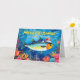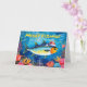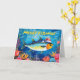 Diese Weihnachtskarte zeigt ein farbenfrohes Aquarellportrait eines Fisches, das eine Weihnachtsmannmütze mit der Aufschrift "Merry Fishmas" trägt.