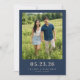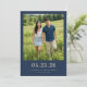 Diese Hochzeitseinladung zeigt ein charmantes Foto von zwei Personen, die Hand in Hand durch ein üppiges grünes Feld laufen und eine lässige und romantische Atmosphäre schaffen. Das Design verwendet eine lebendige Farbpalette, die von den Grüntönen des Grases und der Bäume dominiert wird, ergänzt durch blaue Denim und hellblaue Kleidung, was ein frisches, lebendiges Sommer- oder Frühlingsgefühl hervorruft. Die Typografie ist sauber und modern, mit fetten Ziffern für das Datum und einfachen serifenlosen Schriften für Namen und Ort, was die Lesbarkeit und Eleganz erhöht. Perfekt für persönliche Feiern, erfasst dieses Design einen unverfänglichen Moment der Freude und der Zusammengehörigkeit und ist somit ideal für die Erinnerung an Verlobungen oder Hochzeiten.