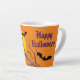 Genießen Sie Ihren Kaffee in dieser "Spooktacular" latte Tasse. Dieses halloween Thema zeigt einen hellgelben Vollmond auf orangefarbenem Hintergrund mit einem Baumzweig und drei Fledermäusen im Vordergrund. Der "Happy Halloween" Text kann angepasst werden. Design umschließt die Tasse.