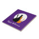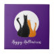 Glückliche Halloween Vollmond Keramik Kachel, mit schwarz-orange Tabbierkatzen auf einem lila Hintergrund. Mit weißen Schriftzeichen können Sie sich mit Ihren eigenen Schriften anpassen. Ein wunderschönes Dekor für Ihr nächstes Halloween-Party!