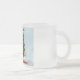 Weihnachtskaffee-Tasse mit drei Snowmen vor Weihnachtsbäumen im Winterschnee.