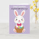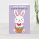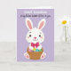 Diese Karte zeigt ein süßes, menschenähnliches Kaninchen, das in der Mitte des Rahmens zentriert ist und mit einem sanften, freundlichen Blick nach vorne schaut 🐰. Das Kaninchen ist strahlend weiß mit weichem Rosa im Inneren der hohen Ohren, einem rosigen Teint auf den Wangen und Rosa auf den Pfoten, was ihm eine zarte, liebevolle Präsenz verleiht. Um seinen Hals sitzt eine übergroße, tiefrosa Schleife, wie ein süßer, geschenkbereiter Touch, der auf Nähe und Fürsorge hindeutet. Das Kaninchen hält einen rustikalen, geflochtenen Korb eng an seinen Körper, als ob es ihn jemand Besonderem auf eine warme, vertraute Weise anbieten würde. Im Korb befinden sich dekorierte Ostereier in kräftigen Farben wie Blau, Gelbgrün und Lila, mit einigen gepunkteten Mustern, die zusätzlichen Charme verleihen 🌷. Der Hintergrund ist ein glattes Lavendelfeld, das den Fokus auf das Kaninchen und den Korb hält, während es sich dennoch weich und frühlingshaft anfühlt