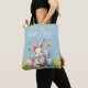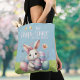 Dieser bezaubernde Ostertotbeutel enthält ein weißes Hasen mit einem rosa Bug um ein Ohr, das ein verziertes Osterei mit vier weiteren bemalten Eiern umgibt. Die Unterschrift über ihr sagt "Happy Oaster to Everybunny" und hat ein niedliches Kaninchenohrpaar auf dem "E" in Ostern. Ein Paar gelbe Vogelarten, die über dem Boden fliegen, vervollständigt die Szene. Ideal für den Urlaub Ostereierjagd, OsterBonbons und Leckereien, oder ein bezauberndes Osterzubehör.