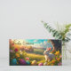 In einem idyllischen, sonnendurchfluteten Tal erstreckt sich eine malerische Frühlingslandschaft mit sanften Hügeln und blühenden Bäumen. Ein helles weißes Osterhasen sitzt aufmerksam im Gras, umgeben von farbenfrohen, kunstvoll dekorierten Ostereiern. Die Blume in lebhaften Farben und das warme goldene Licht der untergehenden Sonne verleihen der Szene eine friedliche und festliche Atmosphäre. Die elegante Schrift "Happy Oaster" schwebt über der Bühne und unterstreicht die festliche Stimmung.