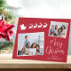 Feierlich rot gefaltete Karte mit 2 Fotos in weißen Rahmen verstreut, eine weiße Silhouette von Rentieren, die den Schlitten des Weihnachtsmannes fliegen, "Frohe Weihnachten" in einem stilvollen weißen Drehbuch und Ihren Namen in schlichter moderner Weißtypografie. Fügen Sie Ihre benutzerdefinierte Nachricht auf der Innenseite hinzu.