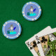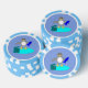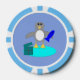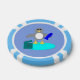 Dieses phantastische Set von Poker-Chips ist mit einem niedlichen kleinen grauen und weißen Pinguin mit beattigen schwarzen Augen und gelben Schnabel und Füßen ausgestattet. Der Pinguin hält einen großen blauen Fisch mit einem Flossen und stehend auf einem blassblauen Eisklumpen. Neben dem Pinguin gibt es ein offenes Geschenk mit festlichem Band.