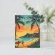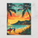 Eine festliche Postkarte mit einem tropischen Hawaii Weihnachten mit Surfern in Weihnachtsmannmützen, Palmen und einer goldenen Sonnenuntergang Strand-Szene. Eine lustige und einzigartige Urlaubskarte.