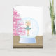 Dieses schöne Grußkarten-Design bietet eine blonde Ballerina in einem blauen Tutu Tanz in einer Schneekugel auf einem Holztisch/Regal vor einem rosa Weihnachtsbaum mit "Frohe Weihnachten" Text.