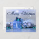 Herrliche, schimmernde blaue Weihnachtsdekorationen auf einem silberblauen Hintergrund mit einem Weihnachtsgeschenk, Töne und Kiefernästen. Twinkelleuchten heben die Worte Frohe Weihnachten in einem blauen, schimmernden Schriftart hervor.
