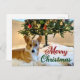 Ein wunderschöner Pembroke Welsh Corgi Hund unter dem Weihnachtsbaum macht ein niedliches Hundeschlittbild Postkarte mit Frohen Weihnachten geschrieben in festlich rot und grün kursiv Skript darunter. Eine hübsche Postkarte für Ihre Freunde und Familie, die Hunde Liebe.