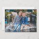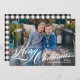 Die Weihnachtsfotokarte bietet ein elegantes, weißes "Frohe Weihnachten"-Kalligrafiebeschild-Overlay-Design mit individuellem Text, der mit Ihrem Namen, dem Jahr und einem beliebten Foto im Landschaftsstil personalisiert werden kann. Enthält ein trendiges rustikales Buffalo-kariertes Muster auf der Kartenrückseite in klassischen Schwarz-Weiß-Farben. Foto Credit: Sunbeam Fotografy www.facebook.com/SunbeamPhotography