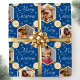 Machen Sie Ihre Urlaubsgeschenke mit individuellem Foto-Packpapier besonders! Diese bearbeitbare Vorlage ist personalisiert mit vier Ihrer Lieblings-Fotos, und den Namen des Empfängers, Ihren Familiennamen oder das Jahr der Ferien. Es enthält sechseckige Bilderrahmen, Set vor einem festlichen Hintergrund von Schneeflocken und Sternen, zusammen mit dem Satz "Frohe Weihnachten". Das stilvolle Design verbindet traditionelle Typografie mit einem klassischen geometrischen Design. Ideal für Fotos, Familien, Freunde und Haustiere! Dieses nahtlose Muster-Geschenkpapier ist mit matter oder glänzender Oberfläche erhältlich. Druckfarben: blau, weiß und goldfarben.
