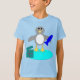 Dieses lustige festliche Shirt mit einem niedlichen kleinen, grauen und weißen Pinguin mit beattigen schwarzen Augen und gelben Schnabel und Füßen. Der Pinguin hält einen großen blauen Fisch mit einem Flossen und stehend auf einem blassblauen Eisklumpen. Neben dem Pinguin gibt es ein offenes Geschenk mit festlichem Band.