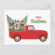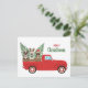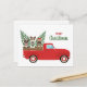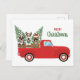 Niedliche Darstellung von drei Hunden, die auf dem Rücken eines kleinen roten Lieferwagen-LKW mit Weihnachtsbäumen fahren.