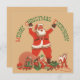 Vintage Illustration Weihnachtsfeierdesign mit einem fröhlichen Weihnachtsmann mit seinem langen weißen Bart und einem Hut. Der Weihnachtsmann ist stehend mit den Armen in der Luft und Kinderspielzeug (Pferd, Puppe, Clown und ein Ball) um ihn herum, der frohe Weihnachten ruft Jeder!