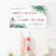 Personalisiertes Banner, um Ihren Gästen oder Nachbarn und Passanten ein frohes Weihnachtsfest und ein glückliches neues Jahr zu wünschen. Das Design umfasst Aquarellgärten aus traditionellem Winterwald, Heilige, Beeren, Mistelen und Kiefernspieße sowie eine nostalgische, mit Kerzen beleuchtete Laterne. Die Formulierung ist in eleganter handgeschriebener Schriftzeichen und Großbuchstaben in Rot und Blau grau geschrieben. Die Vorlage ist für Sie Set, um Ihren Familiennamen hinzuzufügen.