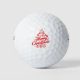 Ein weißer Golfball mit einem roten "Frohen Weihnachten"-Design. Der Golfball ist Set vor einem schlichten, weißen Hintergrund. Das Design "Frohe Weihnachten" ist in einem dekorativen, kursiven Schriftart mit Schnörkeln und Verzierungen. Das Design umfasst kleine Bilder von einem Weihnachtsbaum, Schneeflocken und Ziergegenständen. Der Golfball hat eine abgeflachte Oberfläche, die typisch für Golfbälle ist. Die Beleuchtung ist weich und gerade, was die Struktur des Golfballs und die Details des Designs unterstreicht.