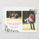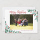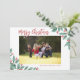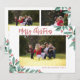 Weihnachts-Fotokarte mit Aquarellholz, Blätter und Beeren grün und rot, ein Foto vorne und zwei Fotos hinten. Gewohnte Weihnachtsgrüße, und Name. Frohe Weihnachten geschrieben in modernen handgeschriebenen Kalligraphie. Fotografie © Storytree Studios, Stanford, CA