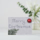 "Frohe Weihnachten" geschrieben im Schnee mit einem dekorativen roten Weihnachtsbaumball und einem schneebedeckten Tannenarm.
