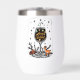Ein festliches und fröhliches Weihnachtsdesign zeigt ein von farbenfrohen Sternen umgebenes Weinglas mit Wein. An der Glasbasis befinden sich Farnzweige, Nadelkone und Hirsche. Der handgeschriebene Text sagt: "Frohe Weihnachten." Dieses Design ist für eine breite Produktpalette erhältlich.