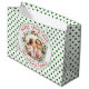 Frohe Weihnachtsblumenkranz mit grünen und Polka Punkte auf weißem Muster Foto große Geschenktasche. Personalisieren Sie mit Ihrem eigenen Foto und Text.