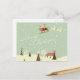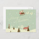 Frohe Weihnachten mit dem Weihnachtsmann, Rudolfs, im Schnee fällt. Schöne Vintage Illustration Frohe Weihnachtsfeiergestaltung mit dem Weihnachtsmann in seinem Schlitten mit seinen Rentieren, die an Heiligabend Spielzeug liefern. St. Nikolaus fliegt durch den Himmel über einen Willkommensgruß mit Häusern, Weihnachtsbäumen, Kiefern, Schneemans und Rentieren. Schneelandschaft und Schnee fallen auf hellgrünem, aquamarinem Hintergrund.