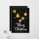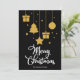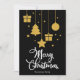 Frohe Weihnachten in einem extravaganten Schriftart dekorativer Schrift mit hängenden Weihnachtsbildern und präsentiert Design. Diese schwarze Hintergrundfarbe Weihnachtskarte ist so konzipiert, dass Sie die Farbe des Hintergrunds ändern können und auch Ihren Familiennamen eingeben oder entfernen können, wenn Sie nur das Design ohne den Text haben möchten.