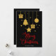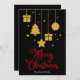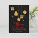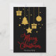 Frohe Weihnachten in einem extravaganten Schriftart dekorativer Schrift in Rot mit hängenden Weihnachtsbildern und präsentiert Design. Diese schwarze Hintergrundfarbe Weihnachtskarte ist so konzipiert, dass Sie die Farbe des Hintergrunds ändern können und auch Ihren Familiennamen eingeben oder entfernen können, wenn Sie nur das Design ohne den Text haben möchten.