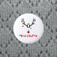 Ein lustiges, niedliches, modernes minimalistisches Bild eines Rentierkopfes mit roter Nase. Mit Weihnachtsschmuck, Bausteine hängen von den Antlers. Keine Hintergrundfarbe, Farben: weiß, rot, grau, blau, grün. Ein handgeschriebenes Stift und der Text: Frohe Weihnachten.
