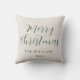 Das saisonale Kissendesign besticht durch ein modernes, elegantes Skriptgrün "Frohe Weihnachten" mit cremefarbenem, beigen Texturhintergrund und einem mit Ihrem Nachnamen personalisierten Text.