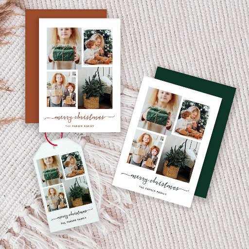 Dieses schlichte und dennoch hochmoderne Foto-Block verfügt über vier Ihrer beliebtesten persönlichen Fotos in einem einzigartigen, vielschichtigen Look Foto Raster. Das Waldgrün und Weiß-Design sagt "fröhliche Weihnachten" in eleganter, trendiger, handgeschriebener Schrift-Typografie und hat einen Platz für Ihren Namen in einem koordinierenden serifenlosen Schriftart.
