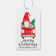 Frohe Weihnachten Niedlich Gnome Red Car Tree Favor Gift Tags bietet einen festlichen Text "Frohe Weihnachten" in modernen Drehbüchern Typografie mit einem niedlichen Gnome, der sein rotes Auto mit einem Weihnachtsbaum trägt. Personalisiert mit Ihrem benutzerdefinierten Familiennamen. Ideal für Weihnachtsgeschenke, Gastgeschenke und Urlaubsgeschenke. Entworfen von © Evco Holidays www.zazzle.com/store/evcoholidays