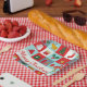 Frohe Weihnachten Niedlich Retro Winter Weihnachten Ikonen Weihnachten Papier Party Teller bietet den Text "Frohe Weihnachten" in modernen roten Schrift Typografie mit Weihnachtsbildern wie Rentier, Baum, Strumpf, Glocke, Schneemann, Geschenk, Kranz, Heilige, Stern, Bonbons, Lebkuchen, Engel und mehr. Von Evco Holidays entworfen www.zazzzle.com/store/evcoholidays