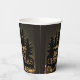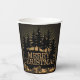 Ein Foto aus einer schwarzen Silhouette eines Fichtenwaldes mit kleinen Lichtern, die hier und da auf den Bäumen wackeln. Vor dem Wald gibt es eine Inschrift in goldenen Buchstaben, die "Frohe Weihnachten" sagt. Der Hintergrund ist dunkel.