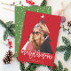 Weiße frohe Weihnachtsgrüße in einem kühlen und modernen Brushed-Skript auf einem festlich roten Hintergrund und ein Weihnachtsbaum gestalten geschnitten Foto Template Weihnachtskarte. Moderne Urlaubskarte oder Weihnachtsfotokarte mit einem Single-Foto in schlichter Anordnung mit Vorder- und Rückseite. Mit Fett*fa*tin entworfen. Einfach mit eigenen Texten, Fotos oder Bildern anpassen. Für individuelle Anfragen wenden Sie sich bitte direkt an fat*fa*tin. Es gelten benutzerdefinierte Gebühren. www.zazzle.com/fat_fa_tin www.zazzle.com/color_therapy www.zazzle.com/fatfatin_blue_knot www.zazzle.com/fatfatin_red_knot www.zazzle.com/fatfatin_mini_me www.zazzle.com/fatfatin_box www.zazzle.com/fatfatin_design www.zazzle.com/fatfatin_ink