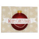 Fröhliche Weihnachtsgeschenktasche mit niedlichem, dunkelroten Weihnachtsschmuck, weißer Farbbandgrafik und weißem Schneeflockenmuster auf beigem Hintergrund.