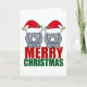 Zwei niedliche Nashörner mit roten Weihnachtsmannmützen auf den Worten Frohe Weihnachten in rot und grün. Ein lustiges Rhinoferlebnis für jemanden, der diese albernen Tiere mag. Ein bezauberndes Weihnachtsgeschenk für Kinder.