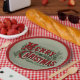 Papier Teller mit dekorativen Worten Frohe Weihnachten, Blume, Holly und Berries in Rot und Grün.