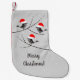 Dieser niedliche kleine Strumpf zeigt drei Vögel, die auf schneebedeckten Zweigen sitzen. Die Vögel tragen rote Weihnachtsmannmützen und genießen sanften Schneefall. Die Illustration erfolgt in beschränkten Grautönen, um die Freude der leuchtend roten Farbe der Hüte zu unterstreichen.