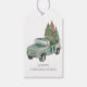 Fügen Sie Ihren Urlaubsgeschenken eine Touch nostalgischen Charmes hinzu, mit diesem rustikalen Weihnachtsschild mit einem Vintagen grünen LKW voller festlicher immergrüner Bäume. Die Vorderseite lautet "Fröhliche Weihnachtswünsche" in klassischer Serifenart, die Rückseite enthält Platz für "To" und "From". Ein perfekter Treffpunkt für die hausgemachte Verpackung, hausgemachte Goodies und Weihnachtsthemen.